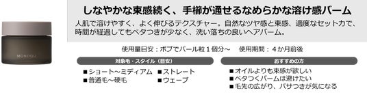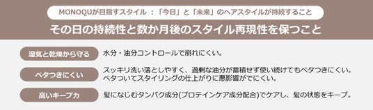 MONOQU(モノーク)は、「ゆるぎない私を、創る。」をブランドメッセージに掲げるスタイリング剤ブランド。流行に左右されず、自分の感性で素直に選択するたったひとつ(MONO)の個性と、自分が考える「格好良さ(QUARITY)」を貫くことを大切にするというブランドの価値感を“MONOQU”と表現。「今日」そして「未来」までのヘアスタイリングを持続させるMONOQUは、使う人の自信も持続させ、「ゆるぎない私」の実現に寄り添います。