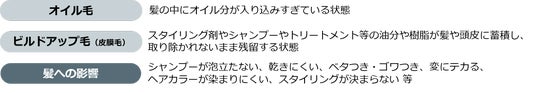 近年、日本人の髪質やヘアスタイルは多様化し、スタイリングアイテムの種類も豊富になってきています。それに伴い、正しいケアの方法やアイテムの見極めは難しく、髪にダメージを与えてしまうケースが増えています。その代表例として「オイル毛」「ビルドアップ毛(皮膜毛)」が挙げられ、このような毛髪の状態はヘアサロンでの施術にも影響を及ぼします。MONOQUは「オイル毛」「ビルドアップ毛」で髪の状態が悪くなることに着目しました。