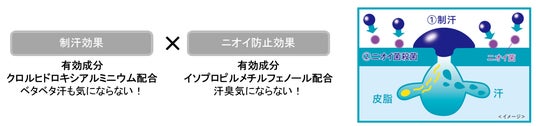 制汗効果と殺菌効果のある2種類の有効成分で、ニオイの原因となる汗をおさえ、ニオイの元となる菌も殺菌。