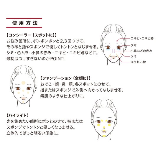 お悩み箇所に、ポンポンポンと2,3回つけて、そのあと指やスポンジで優しくトントンとなじませる。シミ・色ムラ・小鼻の赤み・ニキビ・ニキビ跡などに。