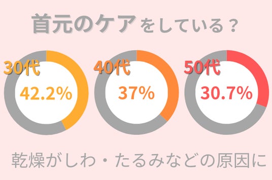 調査の結果、30代・40代・50代の順で、首元のケアをしている方の割合が多いことがわかりました。いずれの年代の女性についても、首元までケアをしている方は半分に満たないことも明らかになりました。