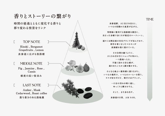 時間の経過と共にTop→Middle→Lastと変化していく香りと、ストーリーの中で移り変わる情景をリンクさせることで自らがそこを歩いているかのようなリアルを感じられる唯一の香りを生み出します。