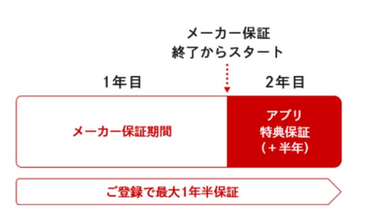 購入いただいた対象製品を、購入から1年以内に公式アプリにご登録いただくことで、通常1年間のメーカー保証が最大1年半まで延長されます。