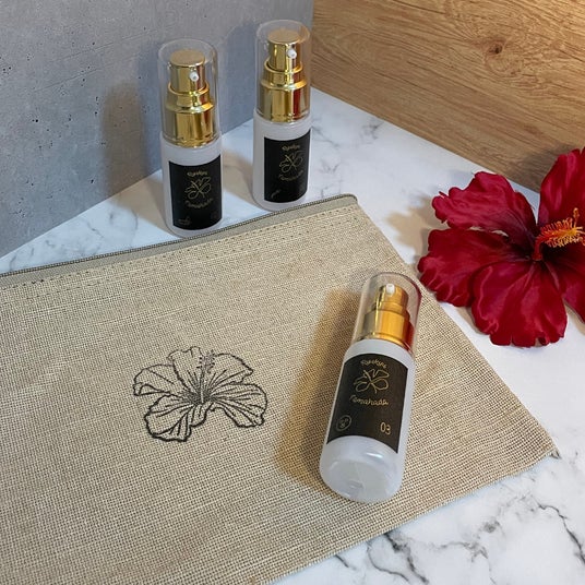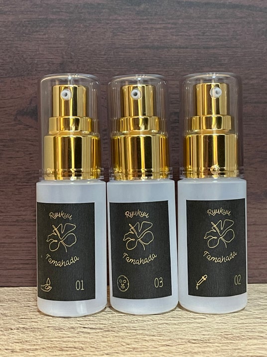 琉球珠肌は宮古島産ハイビスカスのエキスを使用し、日焼けケアにフォーカスしたスキンケアです。国産では珍しい3STEPタイプで、旅行中でも使いやすい製品となっております。