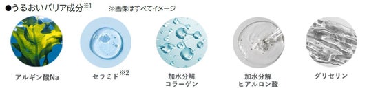 水分を抱え込み、肌を保湿する「アルギン酸Na」、角層バリアのうるおい保持に重要な役割を果たす「セラミド※2」、角層のすみずみまでうるおいを届ける「加水分解ヒアルロン酸」や「加水分解コラーゲン」、「グリセリン」で構成される「うるおいバリア成分※1」を配合。みずみずしく健やかな肌環境をキープします。