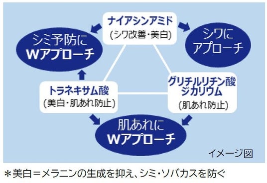それぞれ2つの配合目的を持たせた有効成分「ナイアシンアミド(シワ改善・美白)」と「トラネキサム酸(美白・肌あれ防止)」に加え、「グリチルリチン酸ジカリウム(肌あれ防止)」を配合したことにより、美白と肌あれにはそれぞれ2つの有効成分でのWアプローチが実現しました(右図参照)。加齢により深刻になるシワや、透明感の低下、バリア機能の乱れによる肌あれなど、肌悩みが尽きない“おとな弱バリア肌”をトリプル有効成分で徹底ケア。1品でシワ改善・美白・肌あれまでケアします。