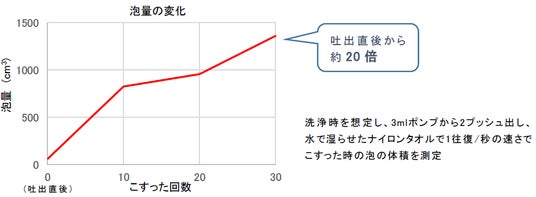 ※3 洗浄時を想定し、3mlポンプから2プッシュ出し、水で湿らせたナイロンタオルで1往復/秒の速さでこすった時の泡の体積を測定した実験データ