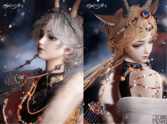 アクセサリーやネックレスには真珠ターコイズ、赤サンゴ、瑪瑙などの宝石をふんだんに使用し、チベット風アクセサリー独特のスタイルを再現しています。また角には本物のカモシカの角の材質を参考に最適化し、質感をより繊細に表現しました。