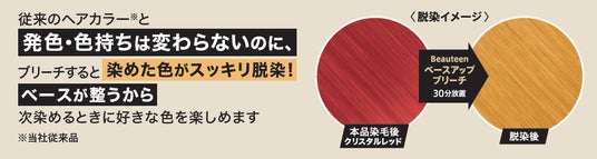 エクスチェンジカラーは色残りがしにくい処方を採用。ビューティーンシリーズの明るい髪へのしっかり発色・色持ちはそのまま、エクスチェンジカラーで染毛した後にブリーチ※をするとスッキリ脱染することができます。スッキリ脱染できることで、髪色のベースが整い、次ヘアカラーをするときに好きな色を選んでカラーチェンジを楽しむことができます。
