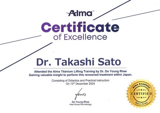 アヴェニュークリニックでは、「チタニウムリフト」の考案者である韓国のDo Young Rhee医師より直接技術指導を受け、Alma Lasers社の韓国法人であるAlma Lasers Korea社より公式技術認定証を取得した医師(佐藤 卓士医師)および看護師が在籍し、同社の公式技術に基づき、チタニウムリフトの効果を最大限に引き出す照射方法で施術を行います。