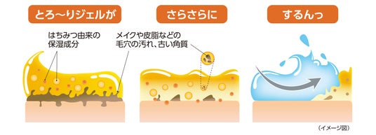 「はちみつ」×「オイル」の効果で、しっかりメイクも毛穴汚れも根こそぎ絡めてオフ。ポイントメイクもこれ1つですっきり落ちます!ヌルつきもなく、サッと洗い流せて、オイル級の洗浄力なのに、はちみつの保湿力で洗い上がりしっとり。W洗顔不要です。