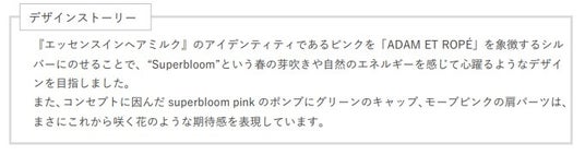 今回「ADAM ET ROPE」とのコラボレーションは、異例の降雨などにより、乾燥地帯に大量の野花が咲く十数年に一度しか起きないと言われている伝説的な現象として知られる“Superbloom”から着想。新たな春を迎え入れてくれるような限定デザインにて、新生活に不安が募る心にも凛としたみずみずしさを湛えて、毎日のヘアケアルーティンを通して特別な体験をお届けします。