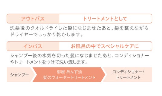 洗髪後ドライヤーで乾かす前に、洗い流さないトリートメント(アウトバストリートメント)として使用するだけでなく、シャンプー後のトリートメント塗布前に、導入美容液(インバストリートメント)としてもご使用いただけます。