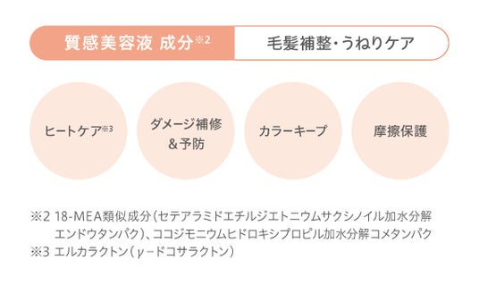 また、ドライヤーの熱を活かしてダメージ補修する「ヒートケア効果」、ヘアカラーの色持ちに配慮した「カラーキープ効果」などきれいな髪の質感をサポートするバリア機能も充実させました。