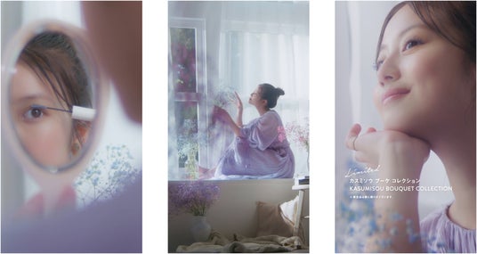 今回のキービジュアルでは、2025年春のメイクアップテーマである “KASUMISOU BOUQUET COLLECTION”をイメージした春の訪れを感じさせる優しく包みこむような空間の中で、儚くも可憐な美しさを引き出すメイクアップを施しました。あどけない印象を与えつつも、大人の魅力も感じる今田さんの表情は、新ビジュアルの儚く美しいイメージをさらに盛り立てています。