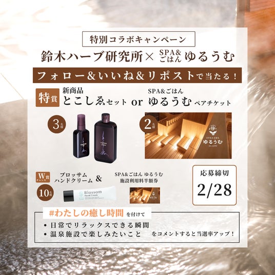 2025年2月14日(金)から28日(金)の期間、Xでコラボキャンペーンを実施いたします。「SPA&ごはん ゆるうむ」のペアチケットや鈴木ハーブ研究所の新作商品など合計で15名様へプレゼントするキャンペーンです。