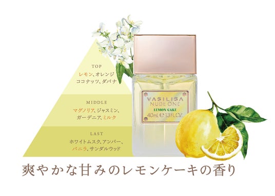 「ヴァシリーサ ヌード ワン レモンケーキ オードパルファム」は、思わず食べたくなるようなレモンケーキの香りを、甘く爽やかな香調で表現したフレグランスです。この春、纏う人の魅力をさらに引き立てる今回の新作フレグランス、ぜひご期待ください。