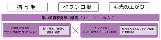 超高圧※¹浸透型プランプ※²エクソソーム*配合。猫っ毛、ペタンコ髪、毛先の広がり・うねりに集中アプローチ!ぷるんと弾むうるツヤ髪へ。