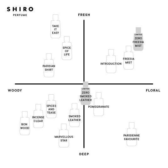 SHIRO PERFUMEシリーズのフリージア ミストとスモーク レザーから、新たな魅力を楽しむ2種のゼロコレクション パフュームが、2025/2/27(木)より数量限定で登場。