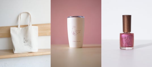 nail polish「whisker」と、Harper Ouk氏の描いた2匹の猫のイラスト付きのオリジナルタンブラーとトートバッグを組み合わせた3点セット。