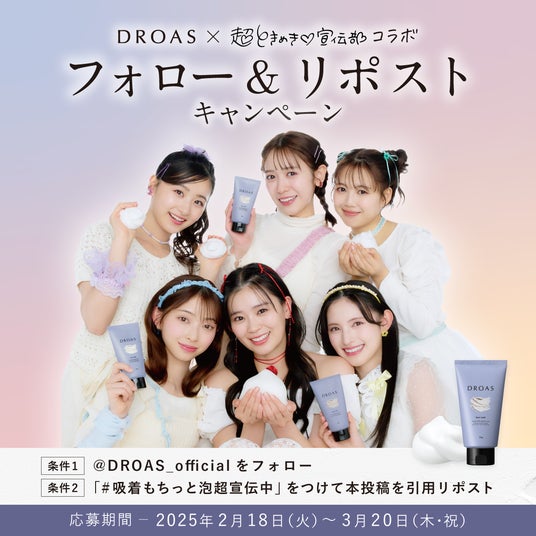 ワンメディア株式会社(本社所在地:東京都渋谷区、代表取締役CEO:明石ガクト、以下「ワンメディア」)は、株式会社I-ne(本社:大阪府大阪市中央区、代表取締役社長:大西洋平、以下「I-ne」)が展開するクレイビューティーブランド【DROAS(ドロアス)】のプロモーションとして、2025年2月17日(月)より、人気アイドルグループ「超ときめき(ハート)宣伝部」とのコラボレーション施策を開始しました。