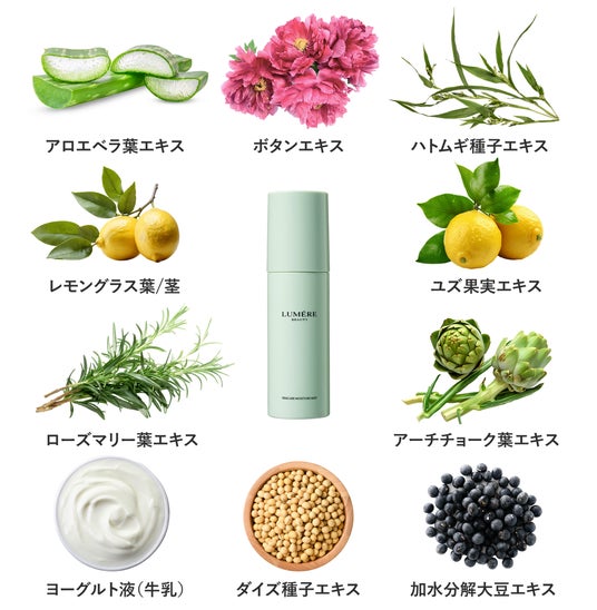 ※1皮膚上の菌バランスを整えること ※2保湿 ※3皮膚コンディショニング ※4乳酸桿菌/セイヨウナシ発酵液(皮膚コンディショニング) ※5グルコシルセラミド、加水分解コラーゲン、水溶性コラーゲン(魚)、プラセンタ(ブタ)、プラセンタ(ウシ)(全て皮膚コンディショニング) ※6乾燥による ※7チョウジエキス、カワラヨモギ花エキス、アロエベラ葉エキス、ソメイヨシノ葉エキス、セージ葉エキス、ドクダミエキス、ボタンエキス、ハトムギ種子エキス、レモングラス葉/茎エキス、ユズ果実エキス、カンゾウ葉エキス、クズ根エキス、ローズマリー葉エキス、シソ葉エキス、クロレラエキス(全て皮膚コンディショニング)※8ダイズ種子エキス、加水分解大豆エキス(黒大豆)、ヨーグルト液(牛乳)、アーチチョーク葉エキス(全て皮膚コンディショニング)