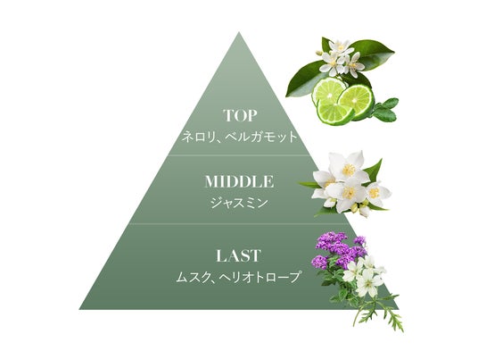 また、ホワイトムスクをベースにさわやかな柑橘系をバランスよく含んだ心地よい香りがほんのり持続し、やさしく包み込みます。