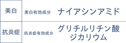 シミの元に届いて効く美白*²有効成分ナイアシンアミドと肌荒れを防ぎ、うるおう素肌の土台をつくる抗炎症*³有効成分グリチルリチン酸ジカリウムを配合しました。
