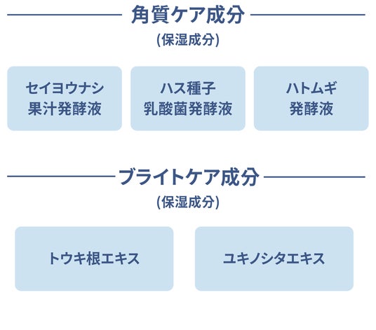 キメの整ったクリアな素肌に導く角質ケア成分のセイヨウナシ果汁発酵液、ハス種子乳酸菌発酵液、ハトムギ発酵液やシミの目立ちにくい均一な素肌に導くブライトケア*⁸成分のトウキ根エキス、ユキノシタエキスを贅沢に配合しました。
