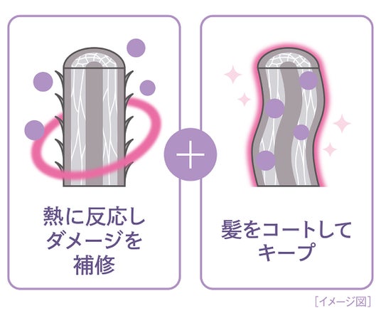 熱に反応するヒートケア成分*³配合。キューティクルのめくれや剥がれなどのダメージを補修し、ヘアアイロン使用時の熱や摩擦によるダメージから守ります。また、スタイルキープ成分*⁴が毛髪の柔らかさを保ちながら外側をコーティング。いつもより低温*²でも、セットしたてのきれいなスタイルが持続します。