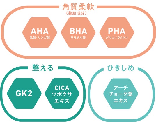 お肌を柔らかくする成分であるAHA(乳酸・リンゴ酸)、BHA(サリチル酸)、PHA(グルコノラクトン)、お肌を整える成分、グリチルリチン酸2K、CICA(ツボクサエキス)、お肌をひきしめる成分である、アーチチョーク葉エキスと成分も豊富です。