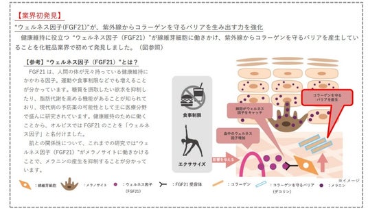 本商品は、健康を維持する因子である“ウェルネス因子※4(FGF21)”に着目。この“ウェルネス因子”が細胞に働きかけ、紫外線からコラーゲンを守るバリア※5を生み出す力を強化する事を化粧品業界で初めて※6発見しました。この発見における「守る」と「攻める」という「2方向からアプローチするという思想」が重要と考え、商品アプローチを行いました。
