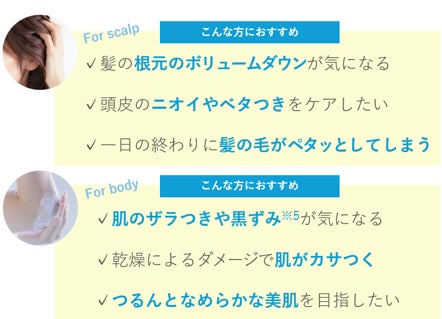 汚れ・角質を落とすだけでなく、頭皮や肌の健康をサポートする成分に着目。5つの軸でバランスを整え、健やかな状態をキープします。