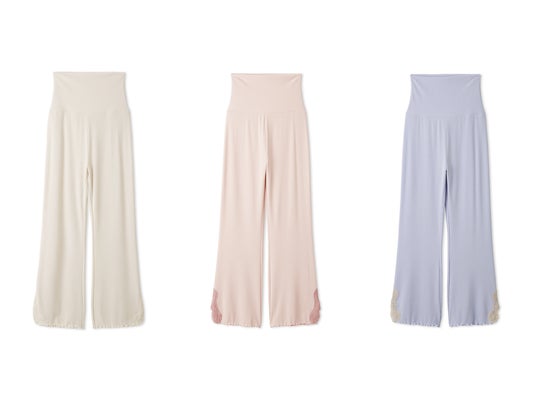 ウエストウォーマーが付いており春夏の冷え対策に重宝するラフィナン(R)のショートパンツとロングパンツ。裾にはレース付きのスリットを入れ、エレガントに仕上げました。