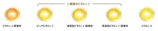 *2 ビタミンA、ビタミンC、ビタミンEのこと:ビタミンA誘導体(リノール酸レチノール)、ピュアビタミンC(アスコルビン酸)、浸透型ビタミンC誘導体(ジパルミチン酸アスコルビル)、保湿型ビタミンC誘導体(ビスグリセリルアスコルビン酸)/全て保湿成分、ビタミンE(トコフェロール)/製品の抗酸化成分