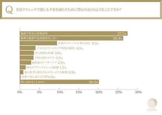 トップ3:1.施術や料金の詳細説明 27.6% 2.無理な勧誘や追加提案をしない 26.4% 3.医師やスタッフの丁寧な対応 9.5%
