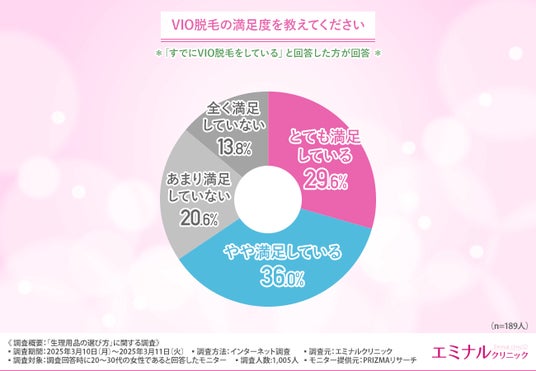 一方で、VIO脱毛を経験した方の約6割が「生理中の快適さが向上した」と実感し、約7割が施術に満足したと回答しており、VIO脱毛が生理中のムレやニオイの軽減、衛生面の向上に一定の効果を発揮する