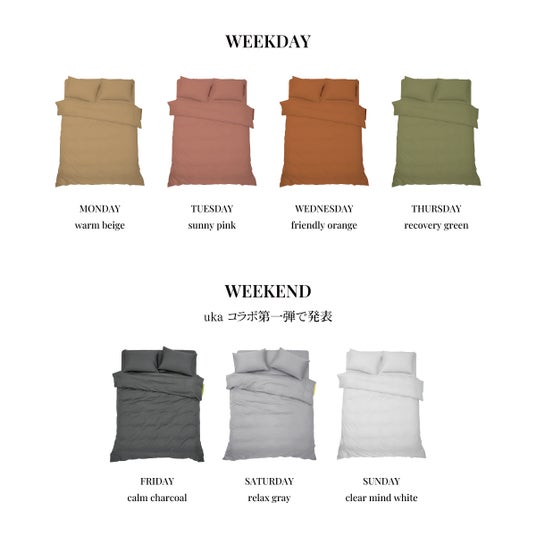 「Sleep Shapes You Beautiful」をコンセプトに、内側から美しくなるための寝具コレクションのカラーをukaが監修。第1弾ではウィークエンドカラー3色を展開し、今回はウィークデーカラー4色を加え、「uka×NORDIC SLEEP – 7 days color collection」 が完成しました。