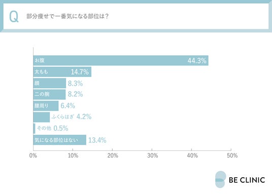 トップ3:1.お腹 44.3% 2.太もも 14.7% 3.顔 8.3%