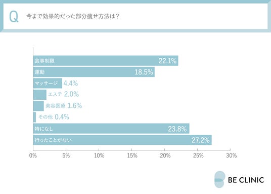 – 効果的だった部分痩せとして食事制限が22.1%、運動が18.5%と主流