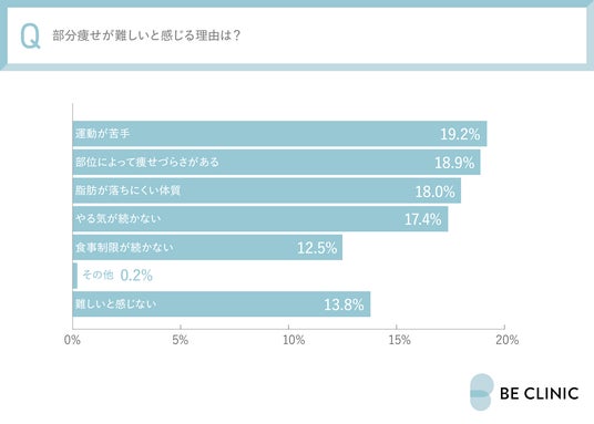 トップ3:1.運動が苦手 19.2% 2.部位によって痩せづらさがある 18.9% 3.脂肪が落ちにくい体質 18.0%