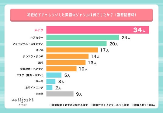 初任給でチャレンジした美容のジャンルは「メイク」が34人で最多