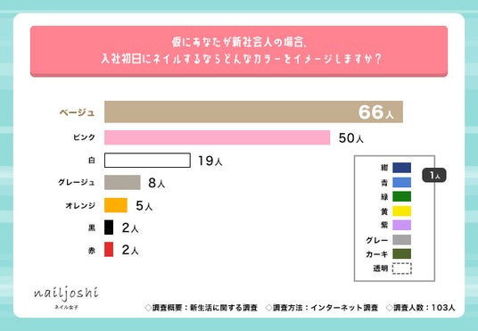– 仮に新社会人として入社初日にするネイルカラーは「ベージュ」(66人)が圧倒的多数、次いで「ピンク」(50人)、「白」(19人)の順