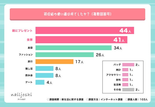 – 初任給の使い道は「親にプレゼント」(44人)が最多、「美容」(34人)は3位