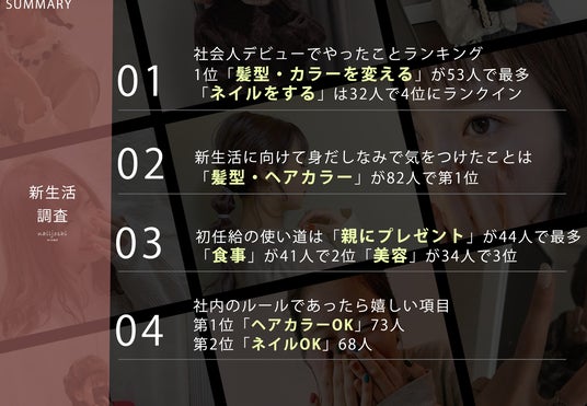 – 社会人デビューでやったことの第1位は「髪型・カラーを変える」(53人)、4位に「ネイルをする」(32人)がランクイン