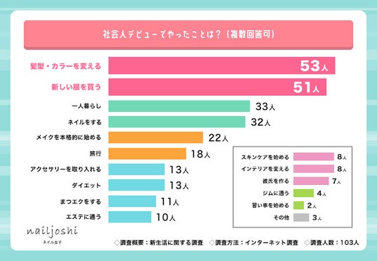 そこで今回、『ネイル女子』(https://www.nailjoshi.com/)を運営するアウトオブザボックス株式会社は、20~30代の社会人女性103名を対象に、新生活に関する調査を実施しました。