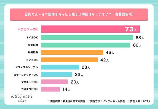 – 社内のルールで「あったら嬉しい」項目の1位は「ヘアカラーOK」(73人)、2位は「ネイルOK」(68人)