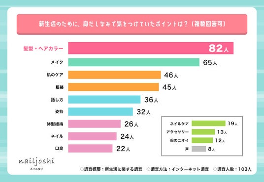 – 新生活に向けて身だしなみで気をつけたのは「髪型・ヘアカラー」(82人)が最多
