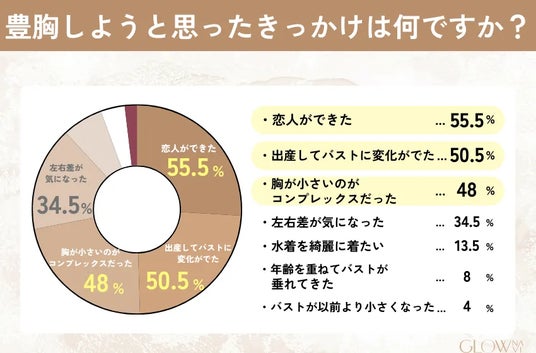 「恋人ができたから」が1番多く、「出産してバストに変化がでたから」、「胸が小さいのがコンプレックスだったから」が続いて多い結果となりました。