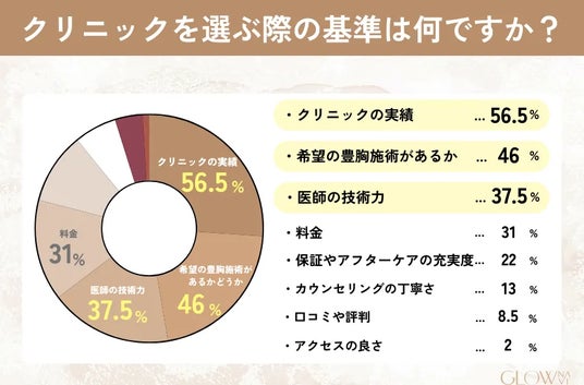 クリニックを選ぶ基準は「クリニックの実績」、「希望の豊胸施術があるかどうか」、「医師の技術力」などが重要視されています。